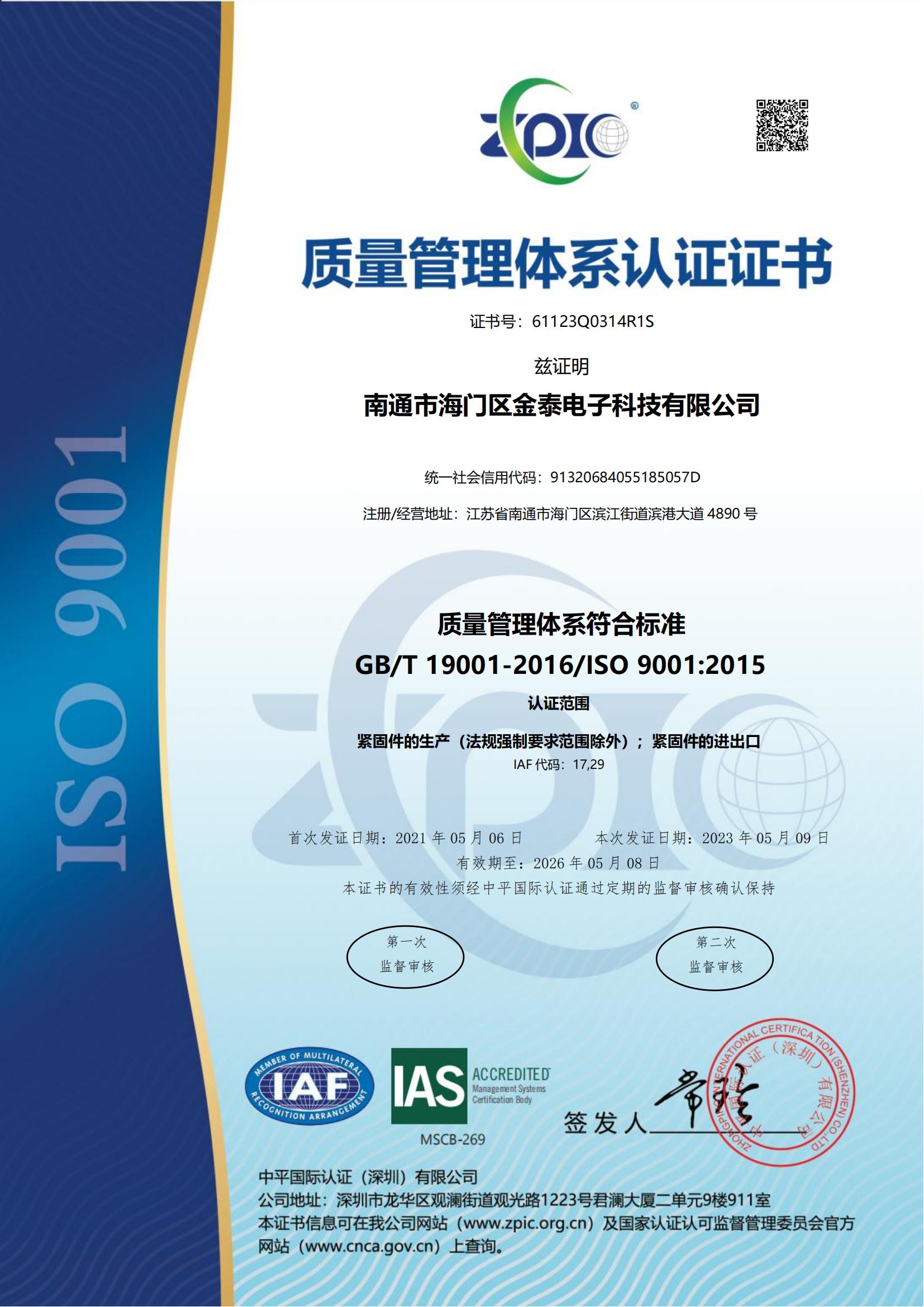 金泰緊固件獲得專業認證